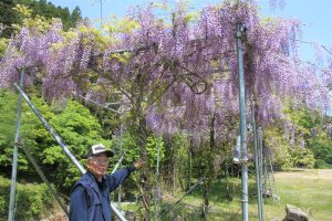 全国的に有名な白毫寺(同市市島町)の九尺フジの見事なフジ棚に感銘を受けた同自治会の足立広司さん(82)が発案。自治会から助成を受けて苗を13本買い、高齢者グループ「健笑会」で鋼管を組んで棚を作った。花穂が九尺(約2・7メートル)伸びてもいいようにと、棚の天井の高さは3メートルにした。開花前と、花が終わった後に肥料を与えている。