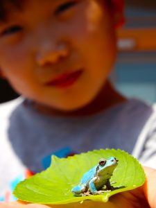 初夏を迎え、カエルの大合唱が始まる中、兵庫県丹波篠山市内で珍しい水色のアマガエルが見つかった。通常は緑色だが、黄色の色素が先天的に欠けて水色になったとみられる。
