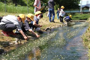 水を中心に、兵庫県丹波市青垣町の自然を見つめる総合学習に取り組む青垣小学校4年生43人が、同町桧倉の清水川で、希少な水草バイカモを観察した。直径1―1・5センチの白い小さな花が無数に水面から顔を出し、児童は川の中の花畑を興味深そうに眺めていた。