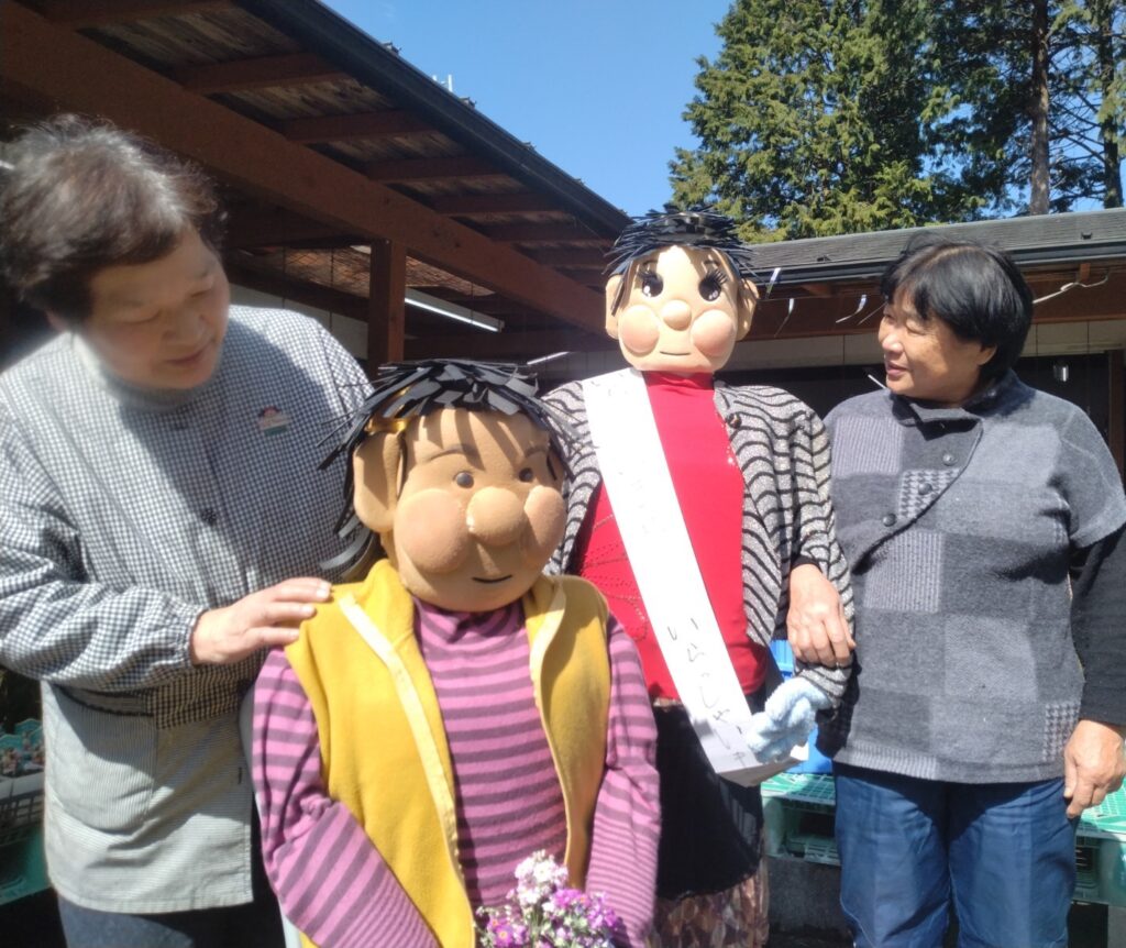 店員の時政秀子さん(74)=同県多可郡多可町=は、「顔が良く似ている」、山根秀香さん(72)=西脇市=は、「店番時と同じエプロンと腕抜き姿で、いでたちがそっくり」、時政さんは「私のかかしは座って楽してる。孫が『欲しい』とねだってね」と笑った。
