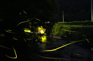 兵庫県丹波市内の川で、初夏の風物詩・ゲンジボタルの飛翔が始まった。木の枝や草に止まった雌を求め、雄が梅雨の晴れ間を縫って、夜の闇に縦横無尽に「命の光跡」を残している。