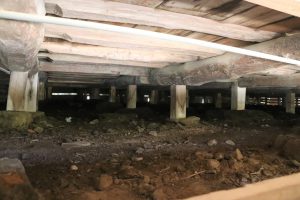 「床下に入らせてください」「それはちょっと…」―。国史跡であり、さらには危険を伴うようなことは許可できないとのこと。縁の下に張られた板の隙間から床下をのぞいたり、写真を撮ったりする許可は下りたので、ライトを頼りに床下を照らした。あらゆる場所や角度から見てみたが、穴らしいものは見当たらない。調査の最初からつまづいた。